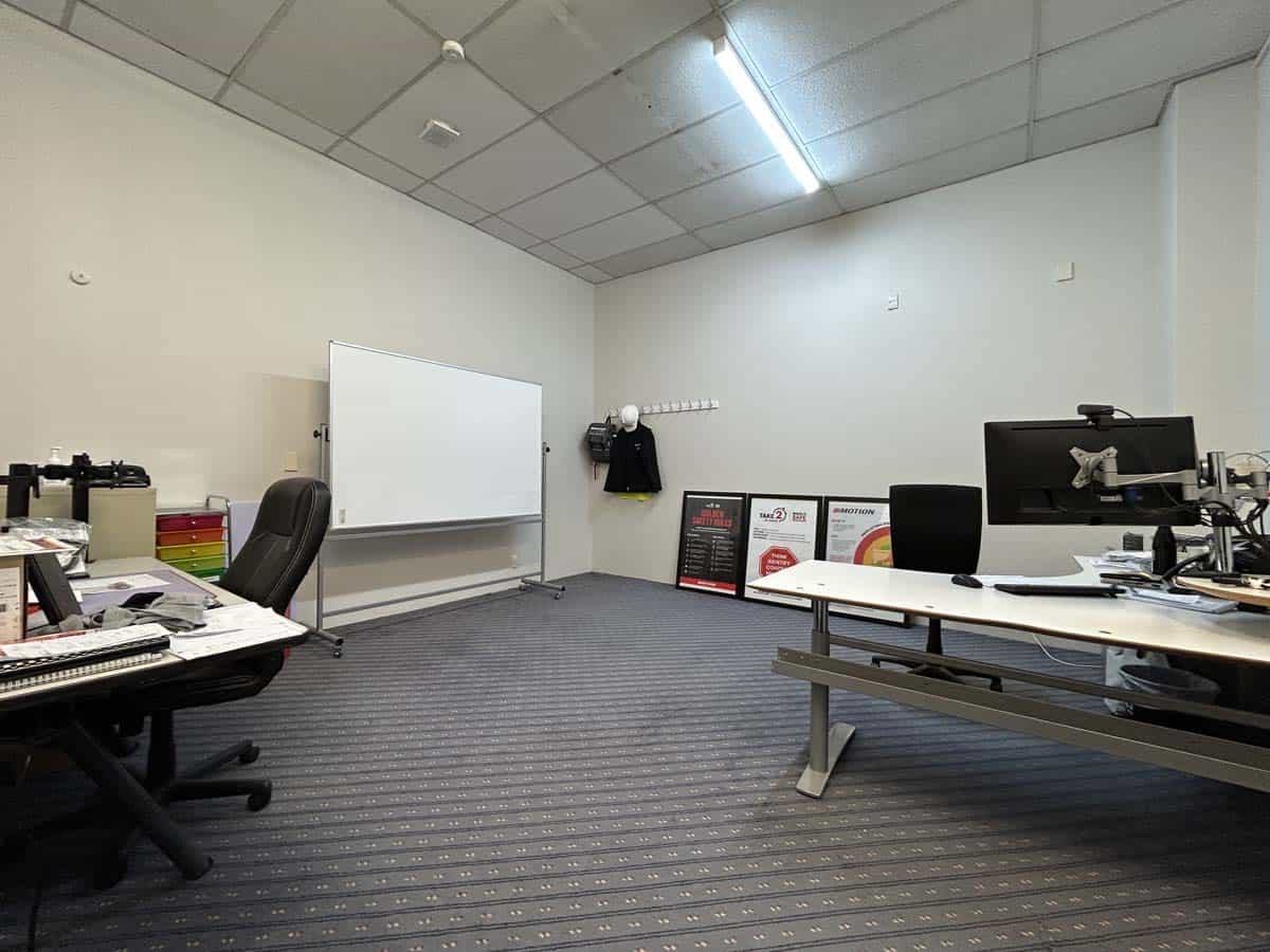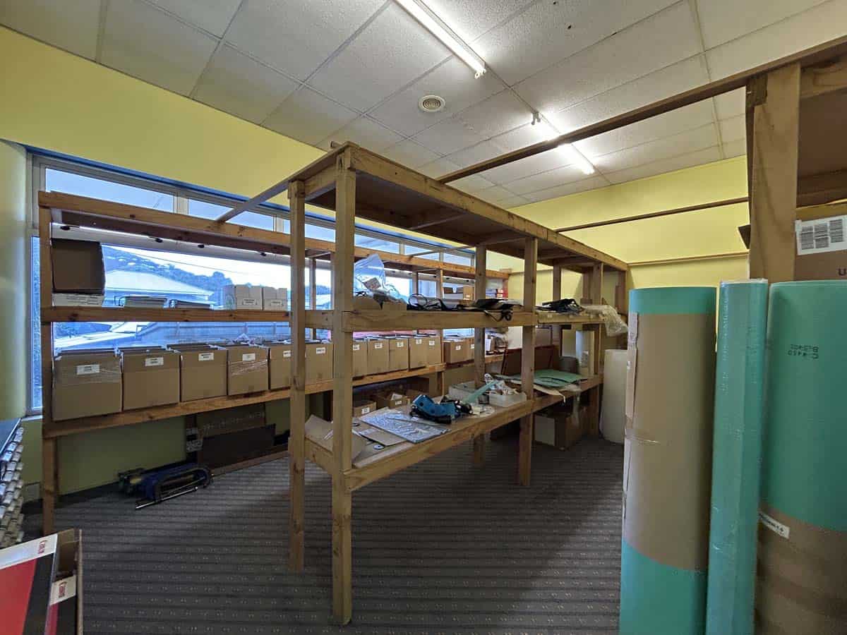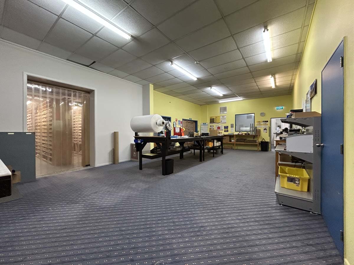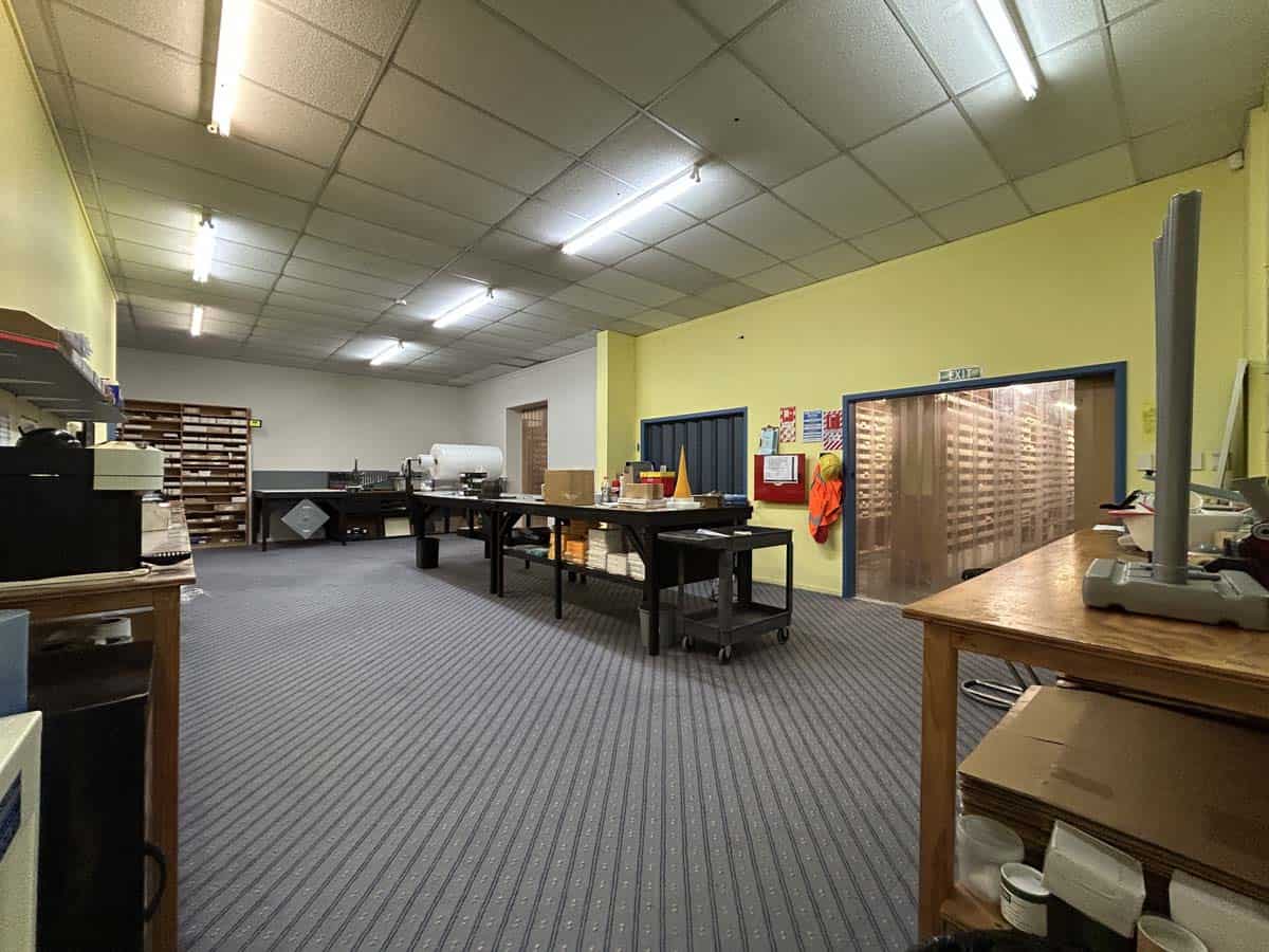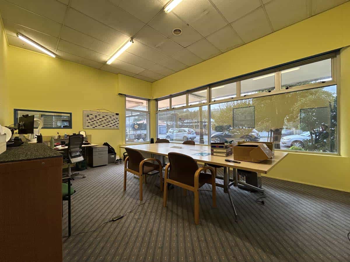 The showroom area is supported by a partitioned office, a meeting room, and a breakout/store room. There is a large open area that could be used for light industrial, a secondary warehouse, or (with the removal of one partitioned wall) could act as a showroom extension.