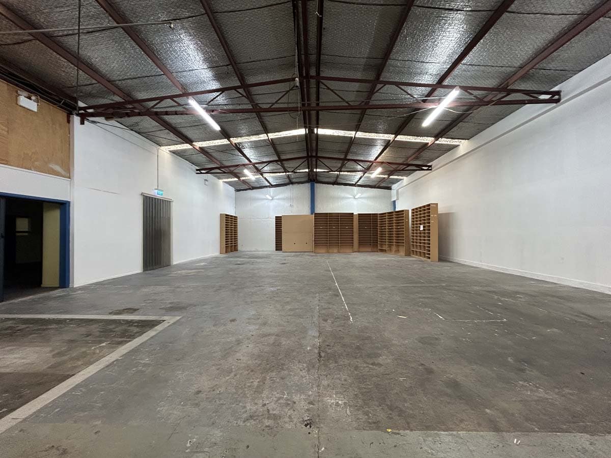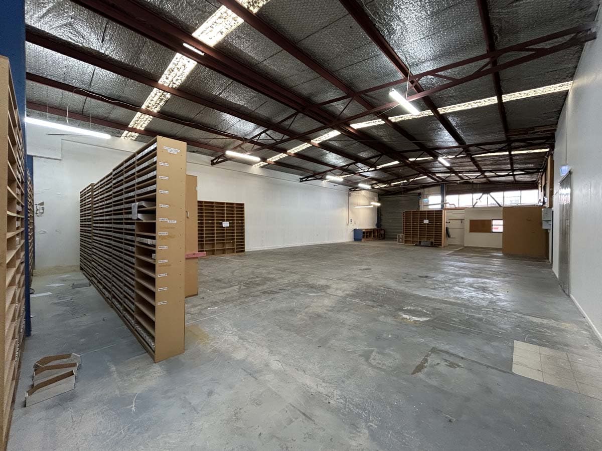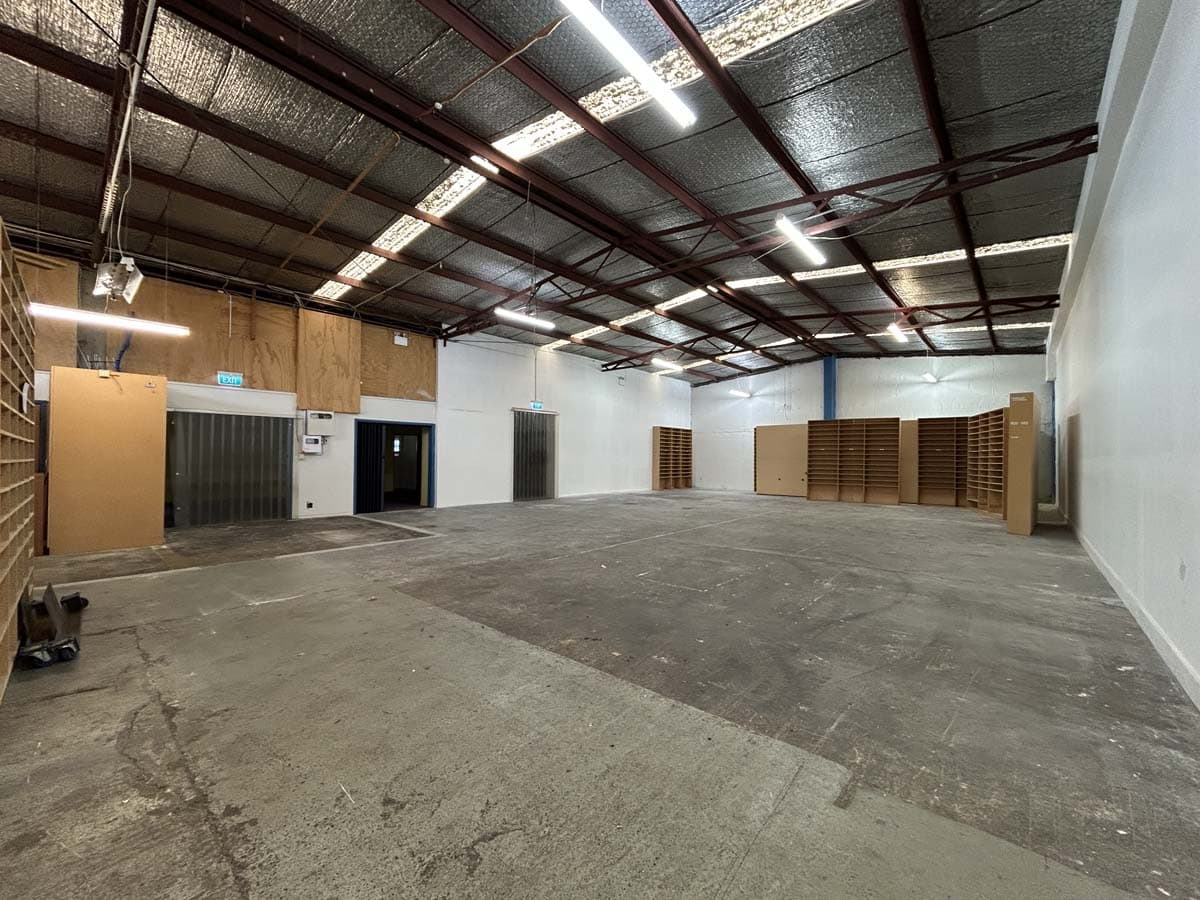 The warehouse features a clear-span layout with excellent natural light and convenient electric roller door access. Staff amenities include a toilet and a staffroom with a kitchenette.