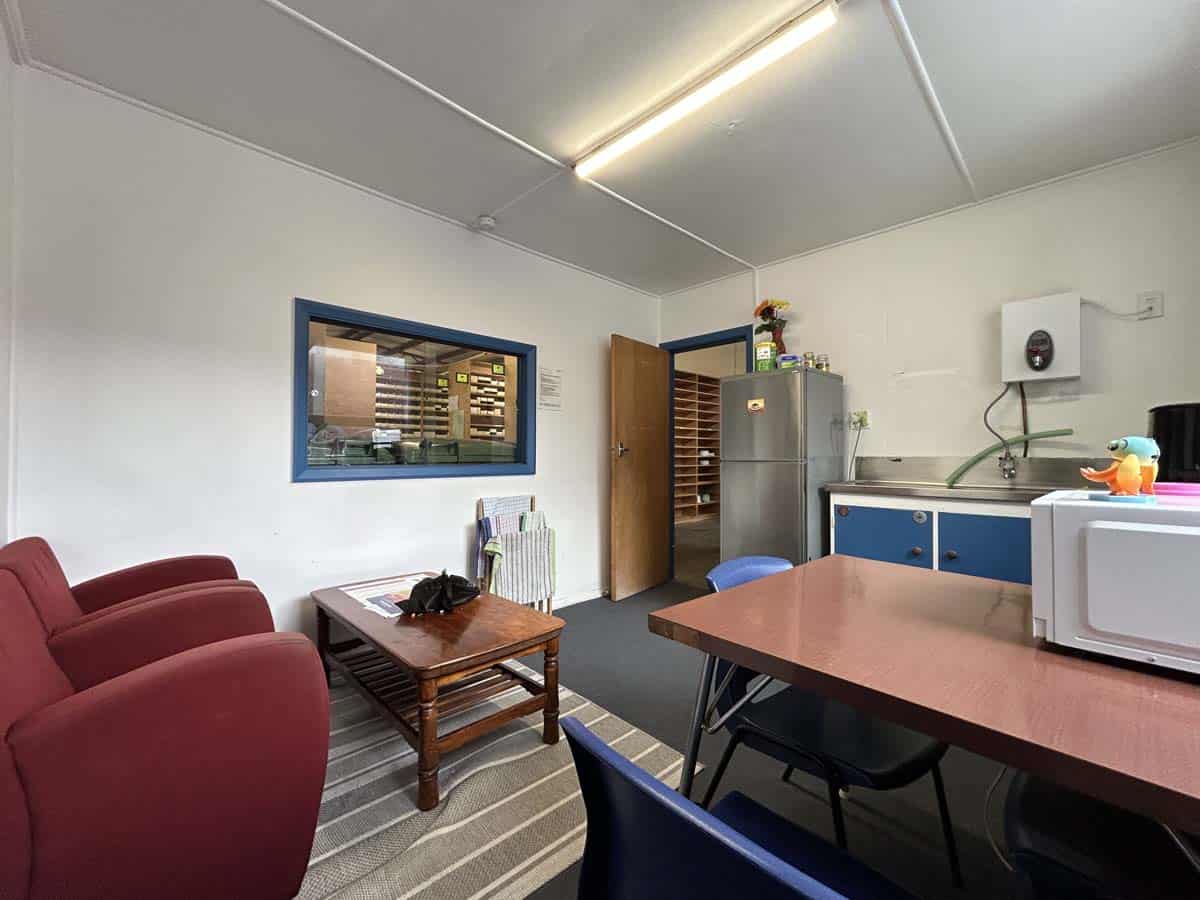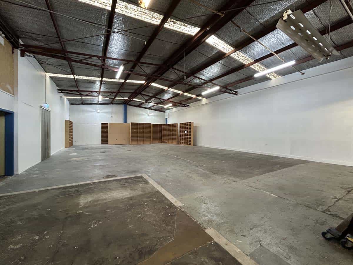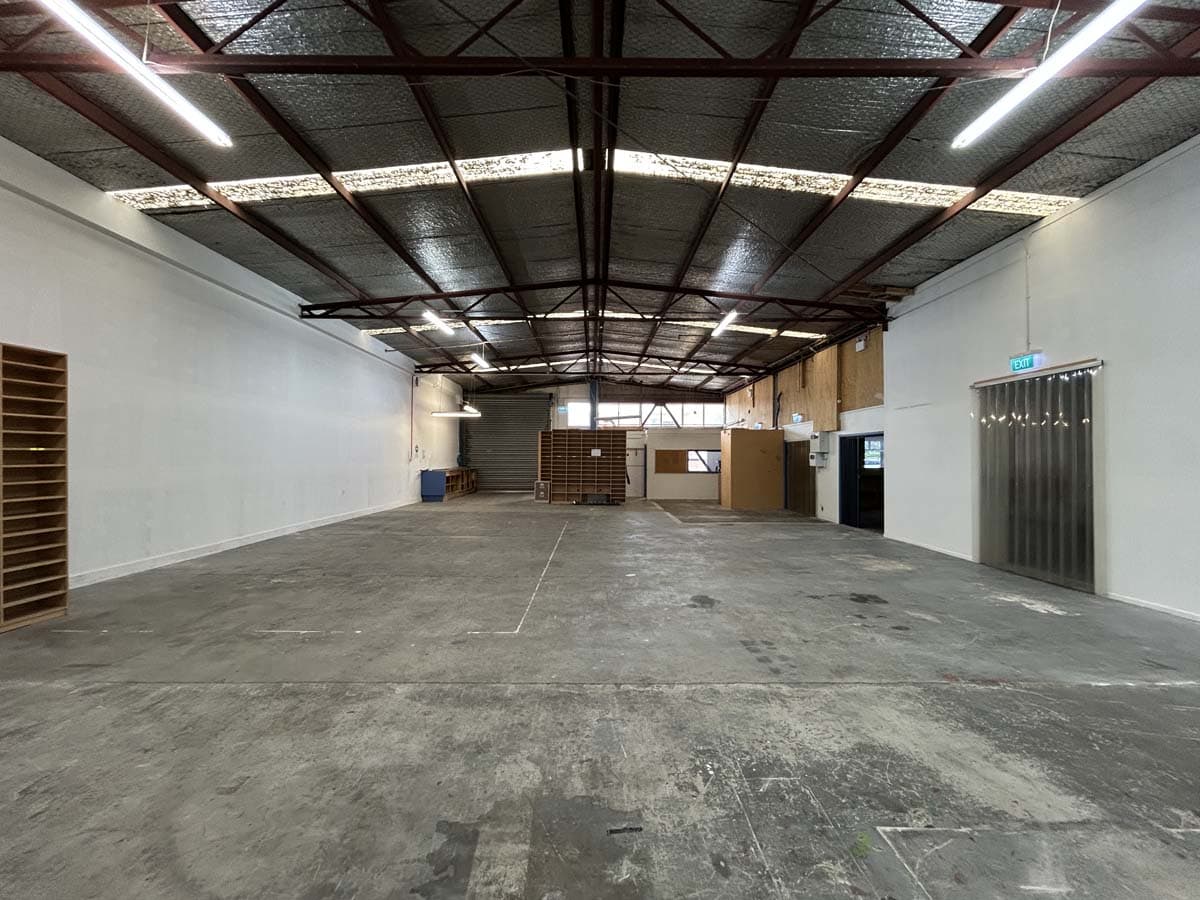 The warehouse features a clear-span layout with excellent natural light and convenient electric roller door access. Staff amenities include a toilet and a staffroom with a kitchenette.