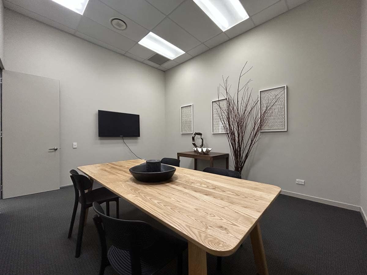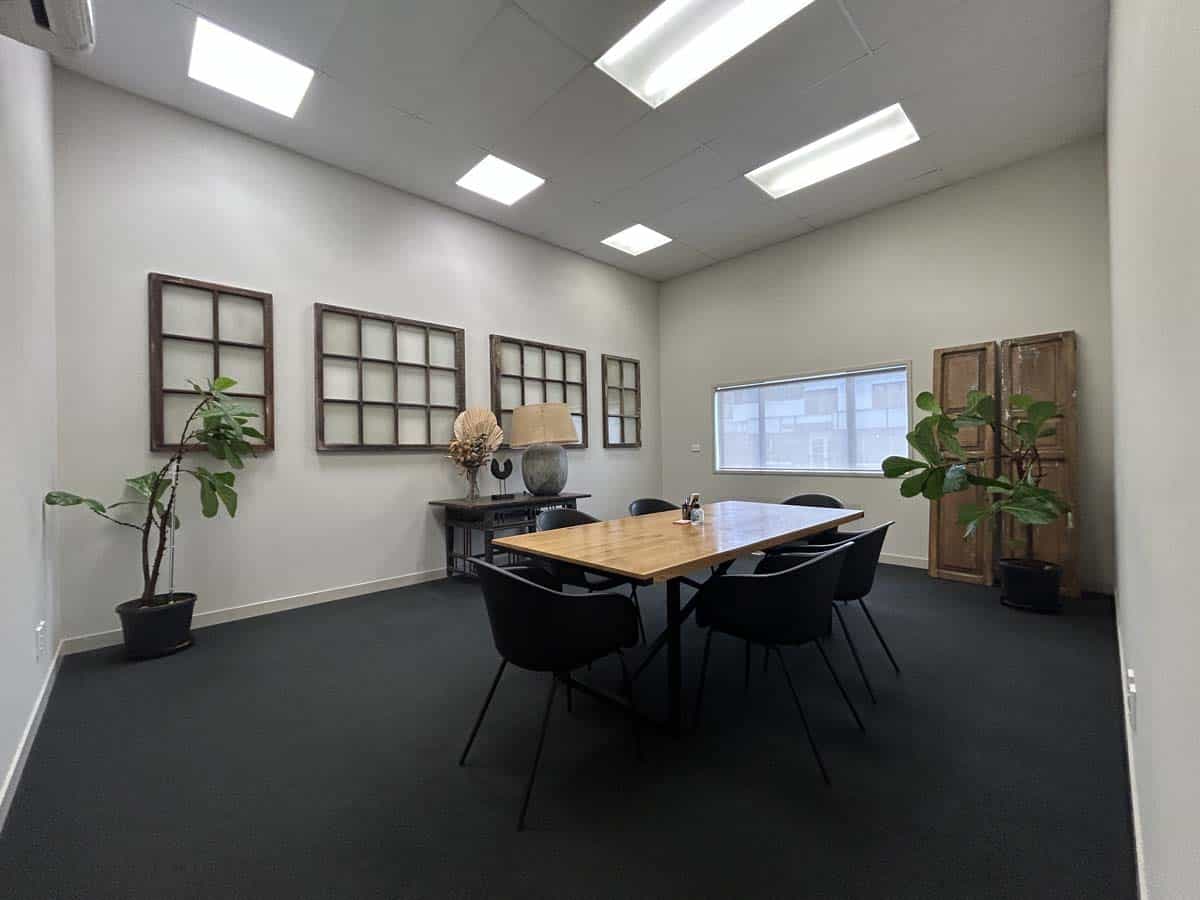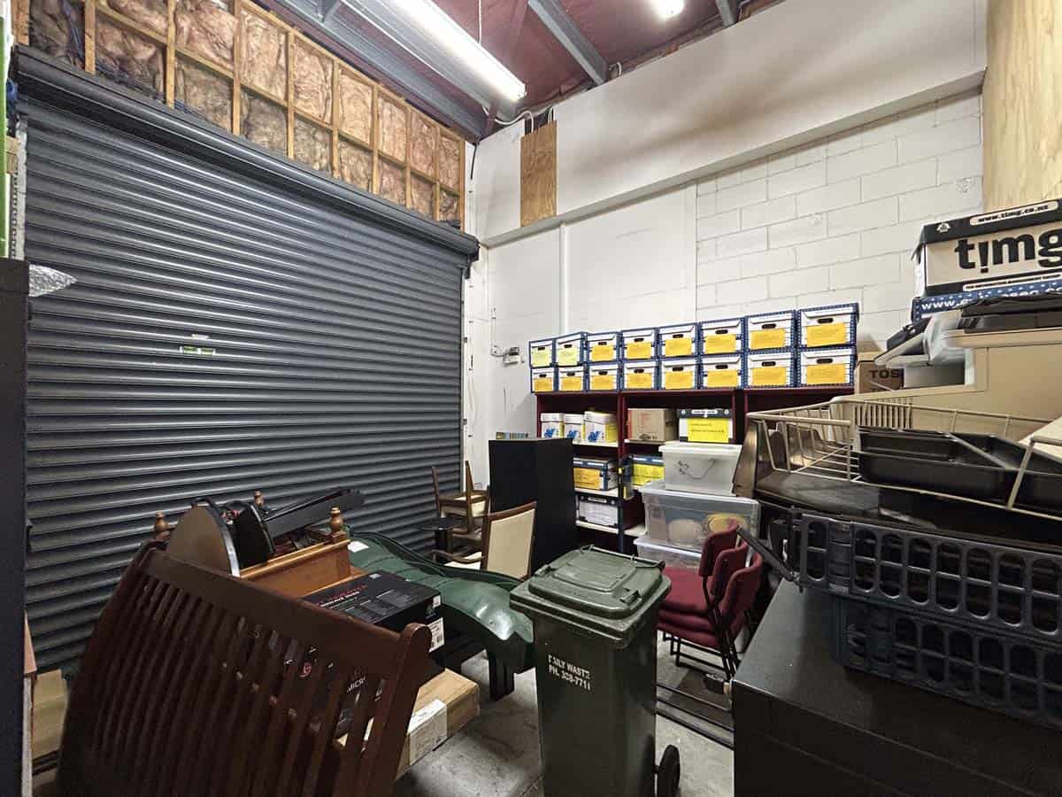 The premises feature a central reception and waiting area at the entrance, with a staffroom and kitchen positioned behind. To the south is an open-plan core surrounded by five partitioned offices. On the north side, a larger open-plan core is complemented by three additional partitioned offices or meeting rooms, along with a boardroom, male and female amenities, and a storage facility (or garage) with both internal and roller door access.