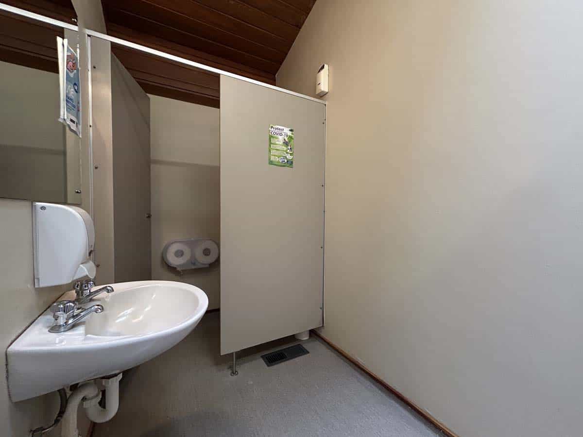 Communal spaces are located throughout the building, including seating areas, a kitchenette, separate men’s and women’s restrooms, and a meeting room.